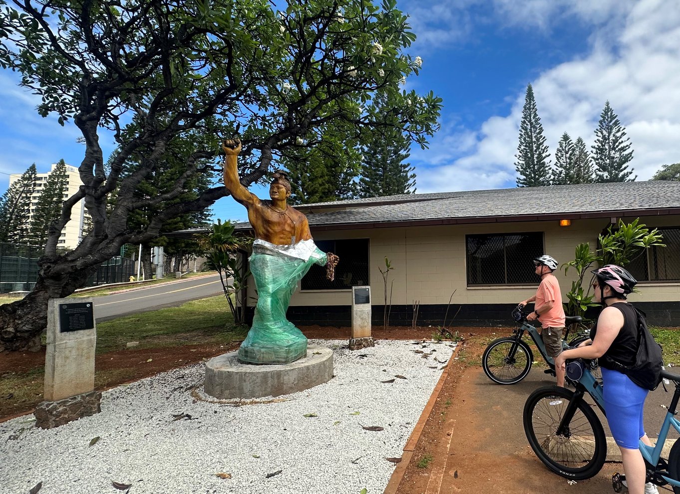 As we roll on our e-stallions equipped with communication system integrated bicycles, We'll take in the unique architectures in the Neighborhood while experiencing Manoa Valley multi-micro climates while ascending 390' elevation gain. We'll be engaged with amazing local fauna and ancient Hawaiian culture as we trek to our goal Manoa Falls 1 mile. ascending 800' elevation gain.