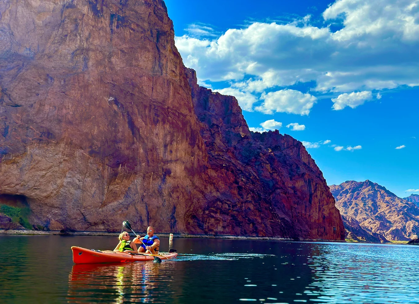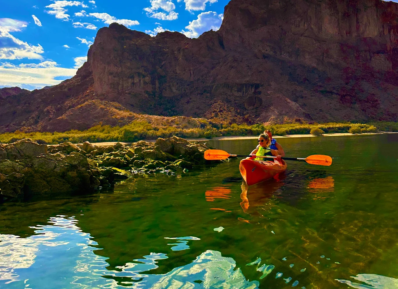 Trade Neon lights for Neon Emerald Green Colorado River as you launch onto glassy, emerald-green water strip between towering 1,000 foot Black Canyon walls—just 50 minutes from Las Vegas. This beginner-friendly Emerald Cave kayak tour blends iconic photo ops, calm paddling, hidden beaches, and bite-size history inside Lake Mead National Recreation Area.