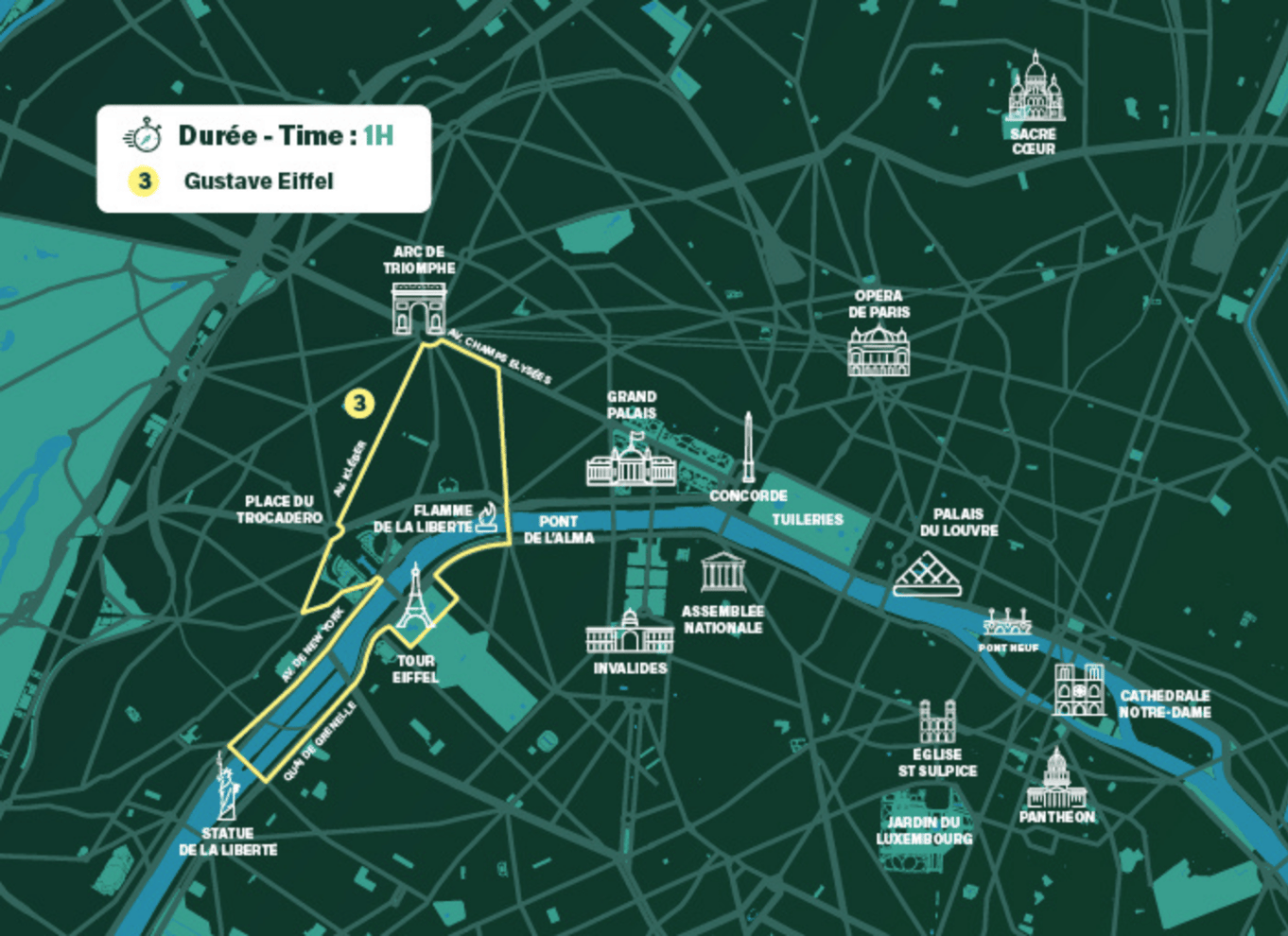 Discover the Eiffel Tower from many points of view in a 30 minutes tour. From the foot of the Eiffel Tower to the place of Trocadero, you will also enjoy the Tokyo Palace and the Flame of Liberty.
