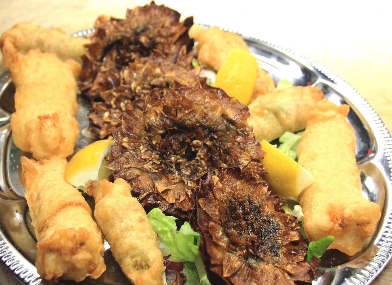 Start with one of the following dishes: Roman Appetizer with Jewish-style artichoke, pumpkin flowers with anchovies and mozzarella, fried codfish or Jewish-style artichoke and a Antipasti platter of cold cuts and cheese.