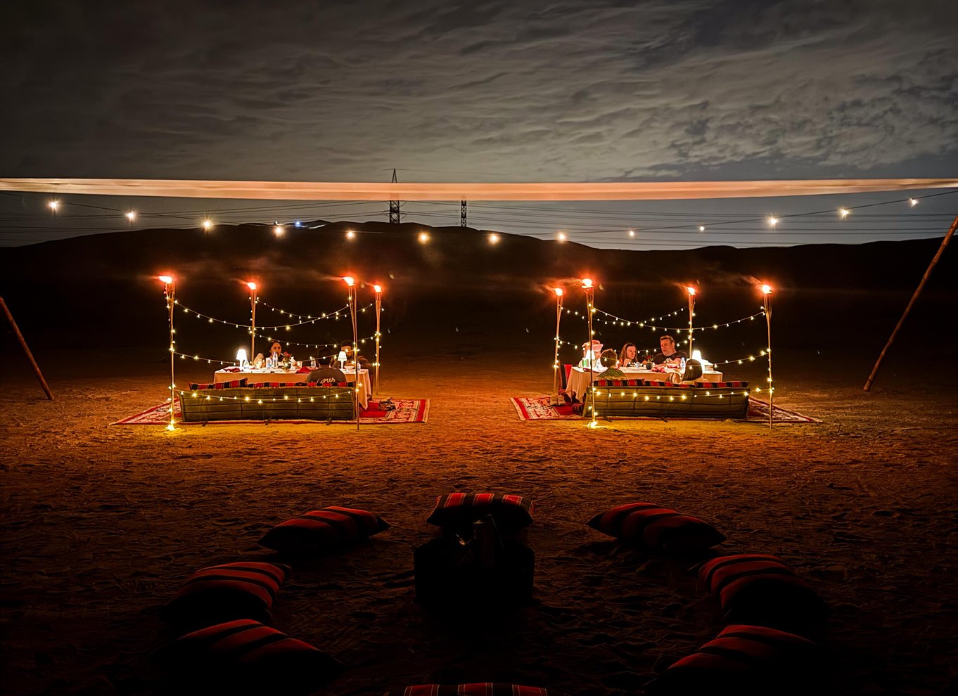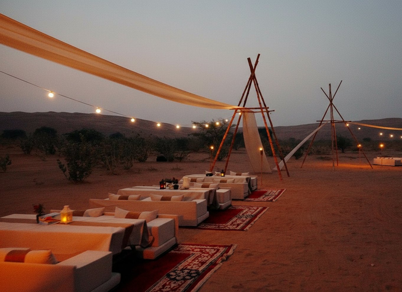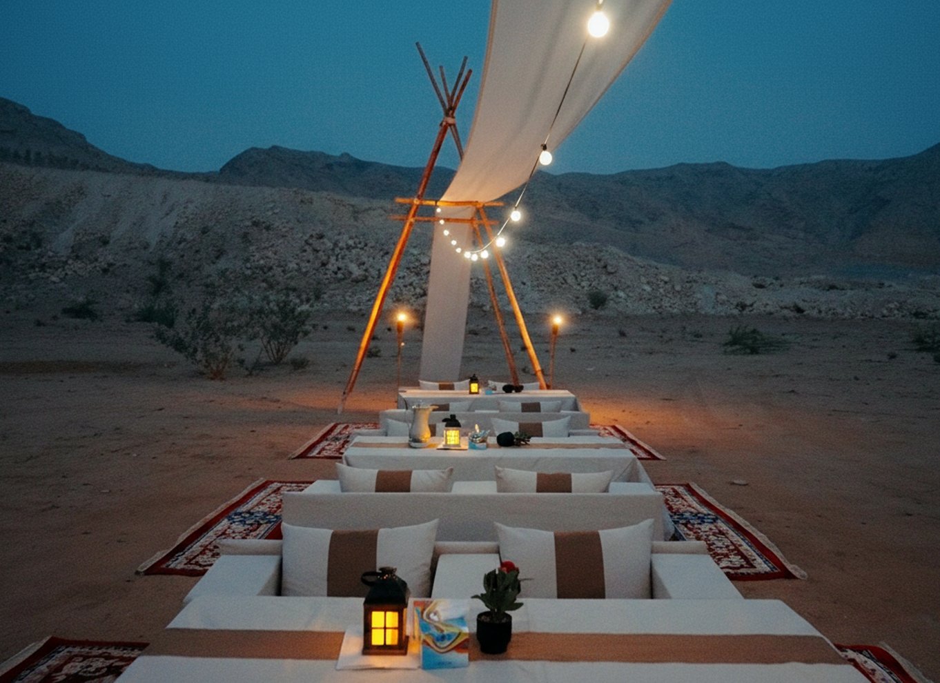 End your experience at Zerzura — an exclusive desert camp — where a gourmet dinner with authentic Arabic dishes awaits under starry skies. Soft Oud music and bohemian dining setups make this an unforgettable escape, perfect for couples, families, or friends looking to combine adventure, culture, and fine dining in Dubai’s desert.