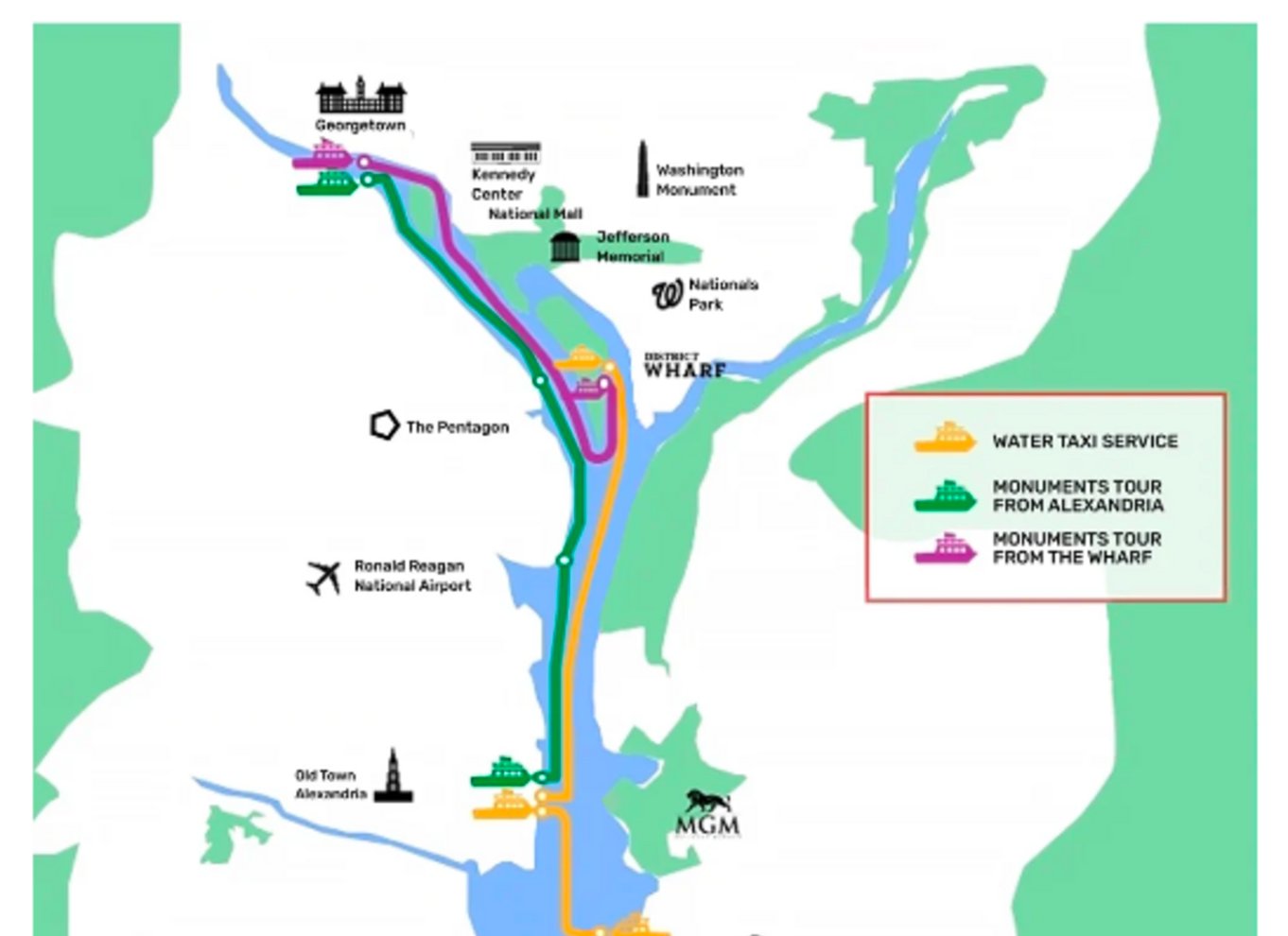 Please note, the water taxi route traveling from Georgetown directly to Old Town Alexandria is the Monuments cruise