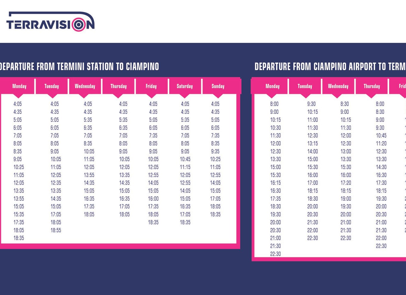- Der erste Bus fährt um 4:05 Uhr von Termini ab und der letzte um 18:55 Uhr