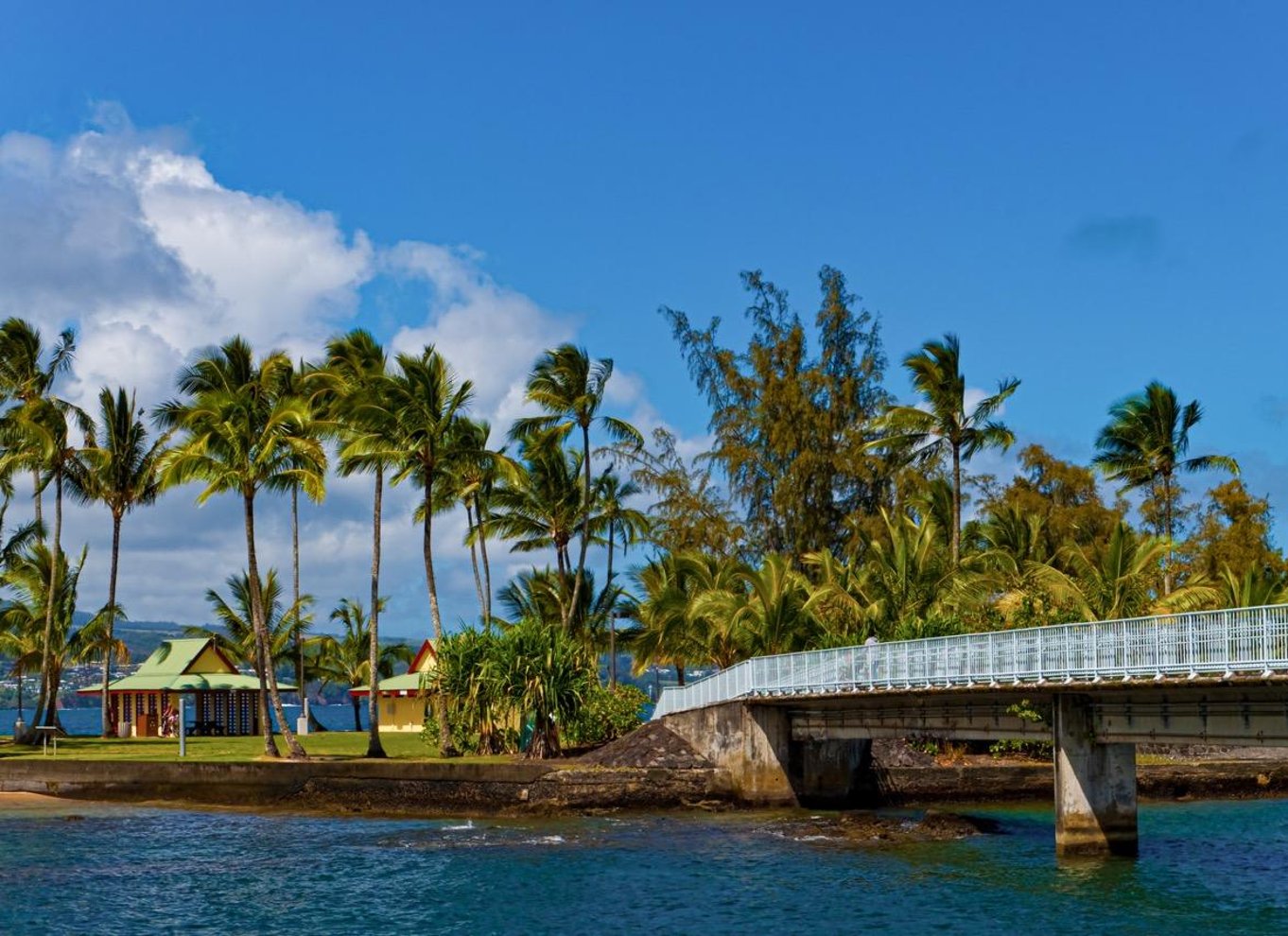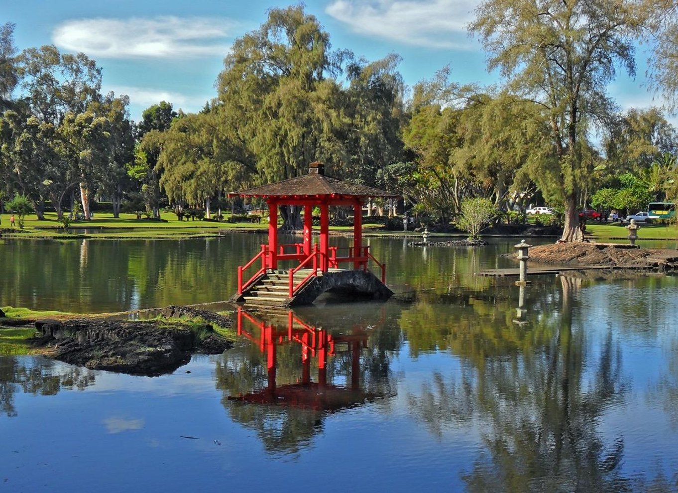 Als nächstes nehmen wir dich mit durch den Liliuokalani Park, ein ruhiges Stück Land mit japanischen Bogenbrücken, Fischteichen und hoch aufragenden Banyanbäumen. Der Park ist der größte authentische Garten im Edo-Stil außerhalb Japans. Du wirst die benachbarte Moku Ola, auch bekannt als Coconut Island, sehen, eine ikonische Insel in der Hilo-Bucht mit malerischen Aussichten und schattigen Palmen.