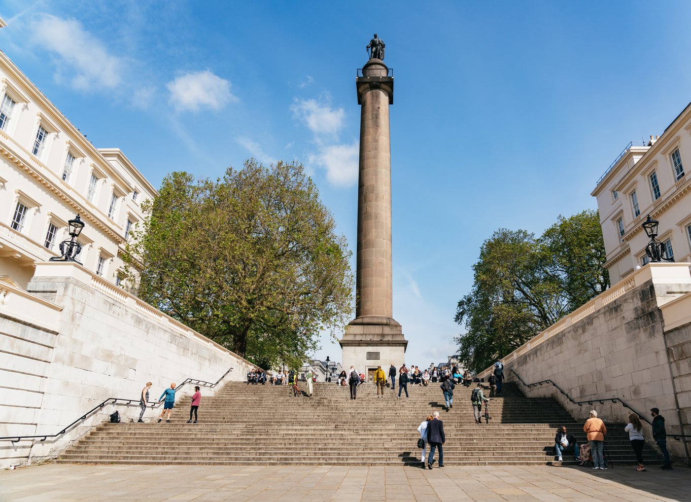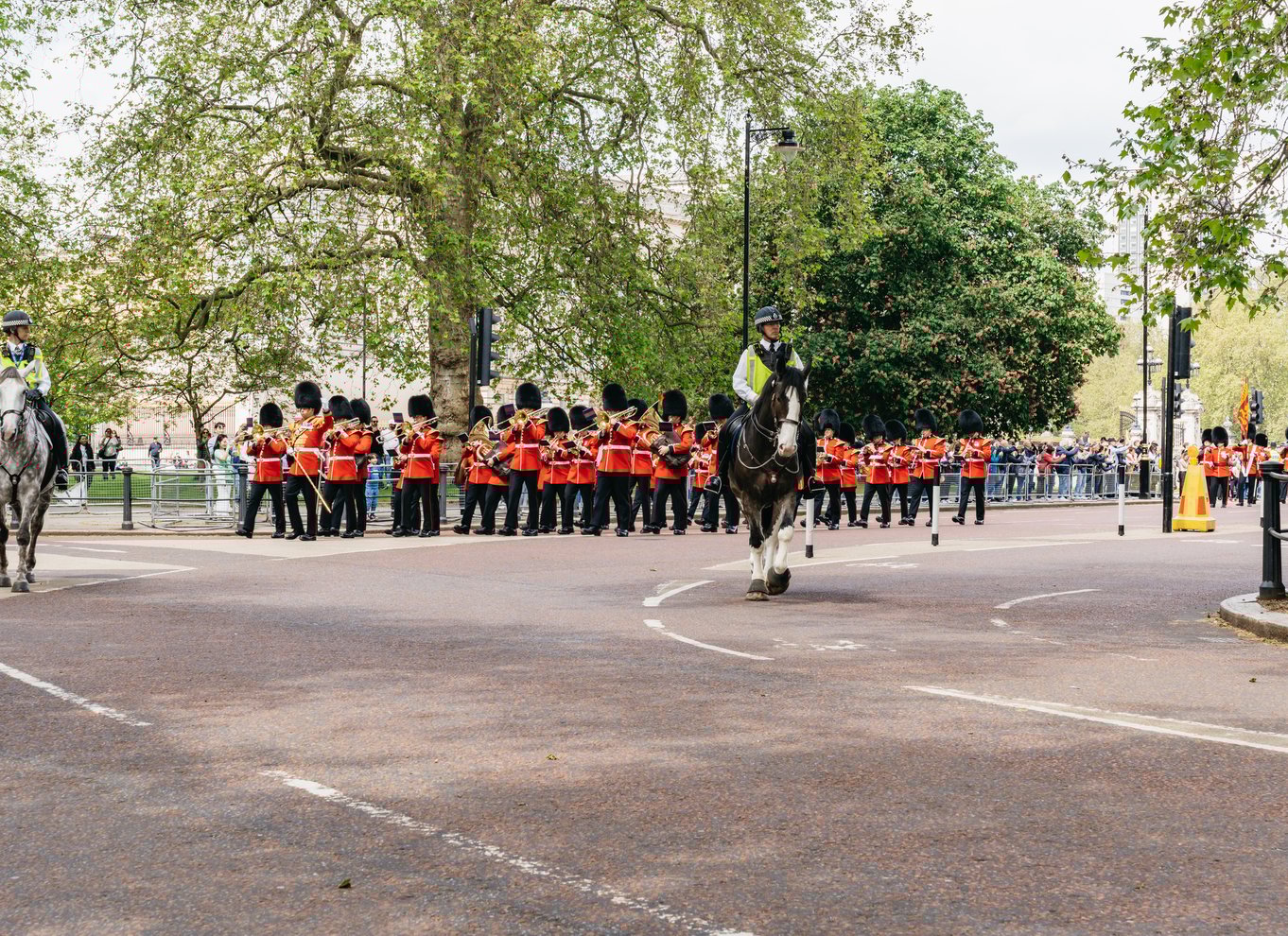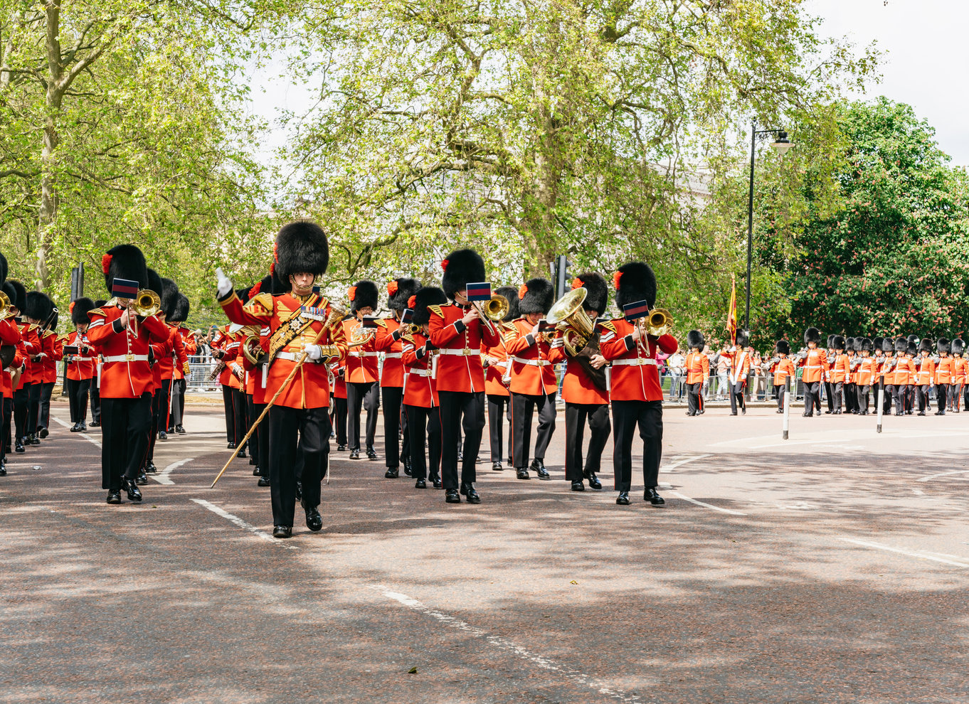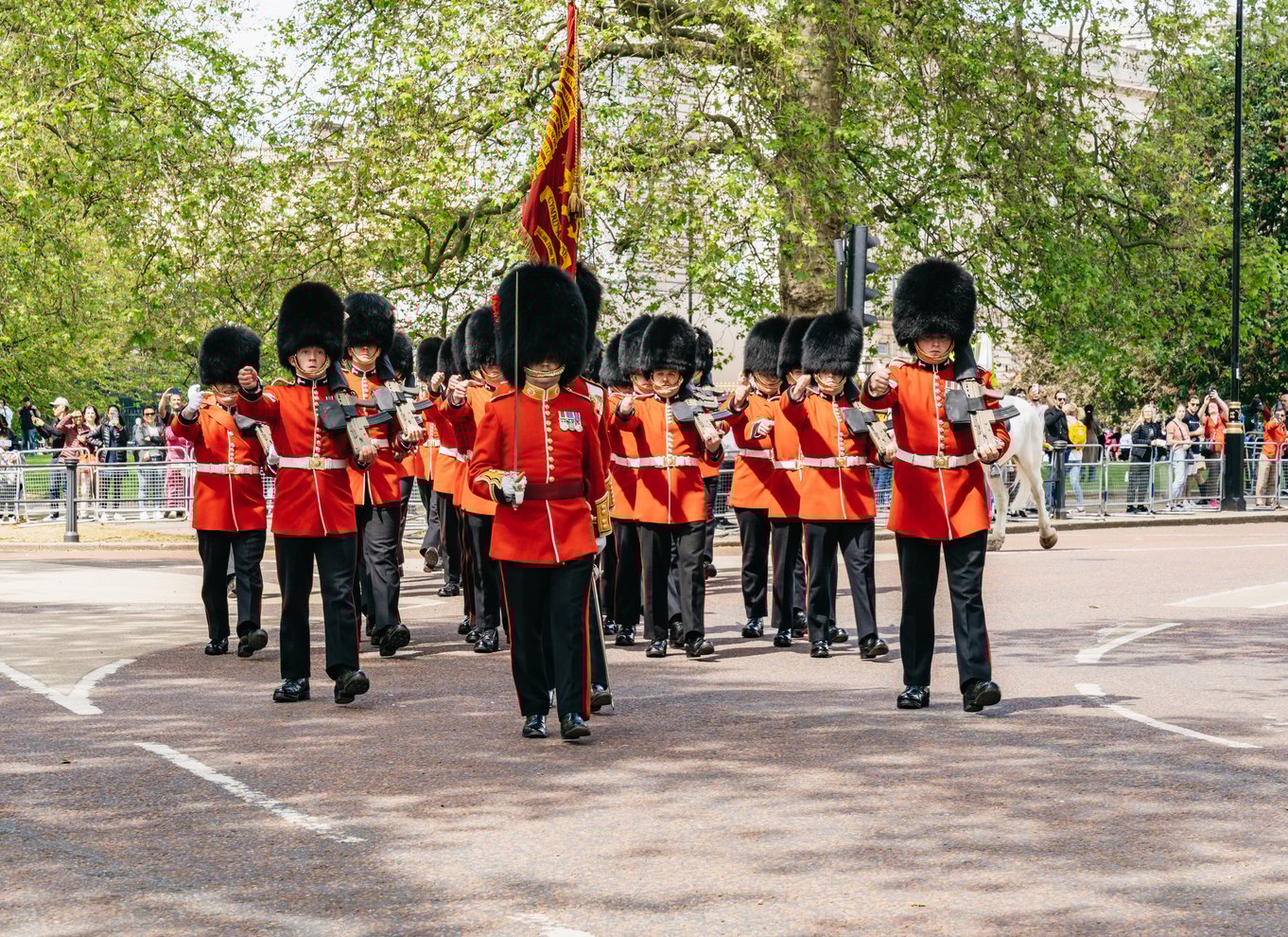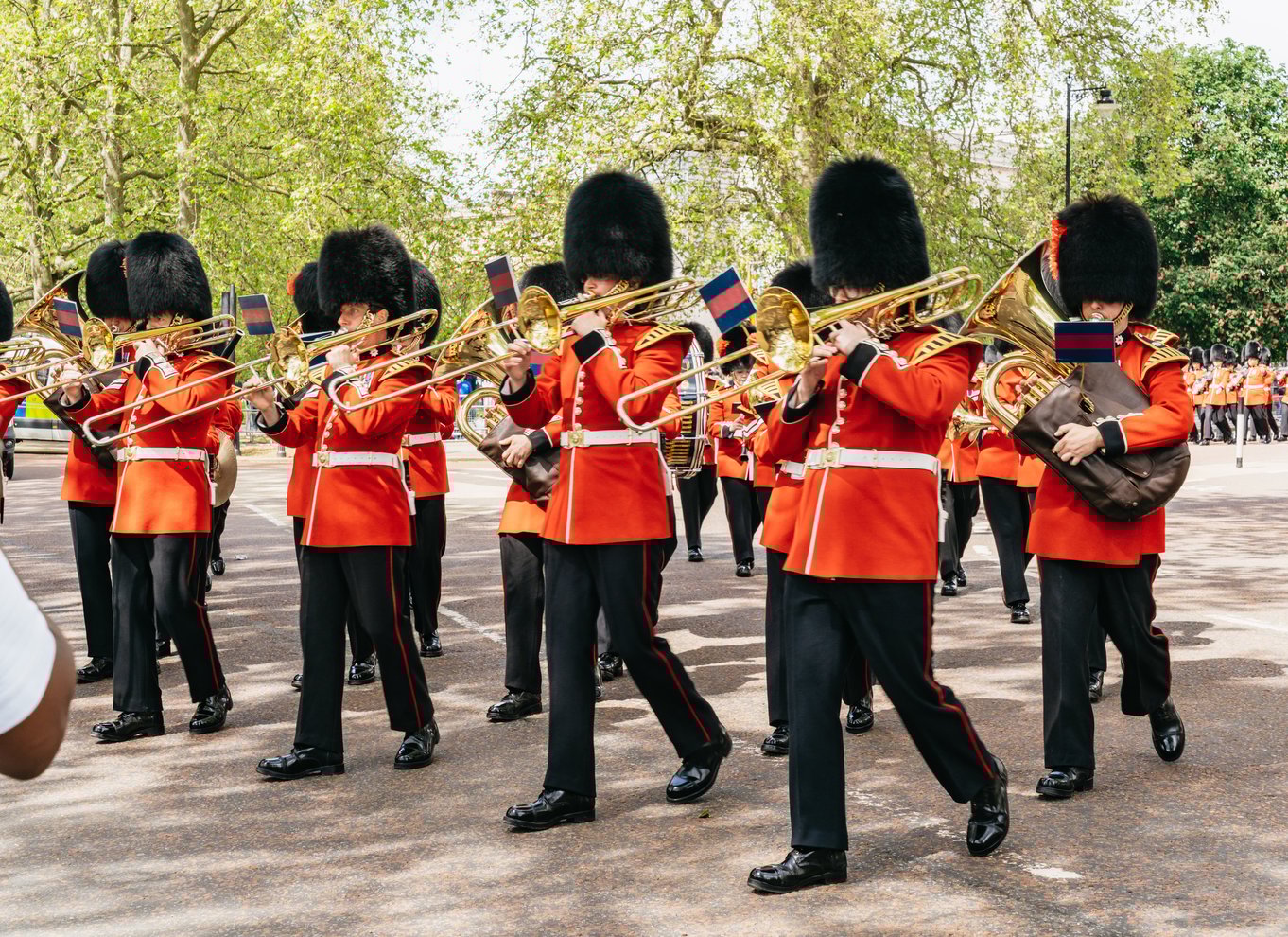 Bewundere die Präzision, mit der die Fußtruppen des Königs in ihren kultigen roten Tuniken und Bärenfellmützen zum Buckingham Palace marschieren.