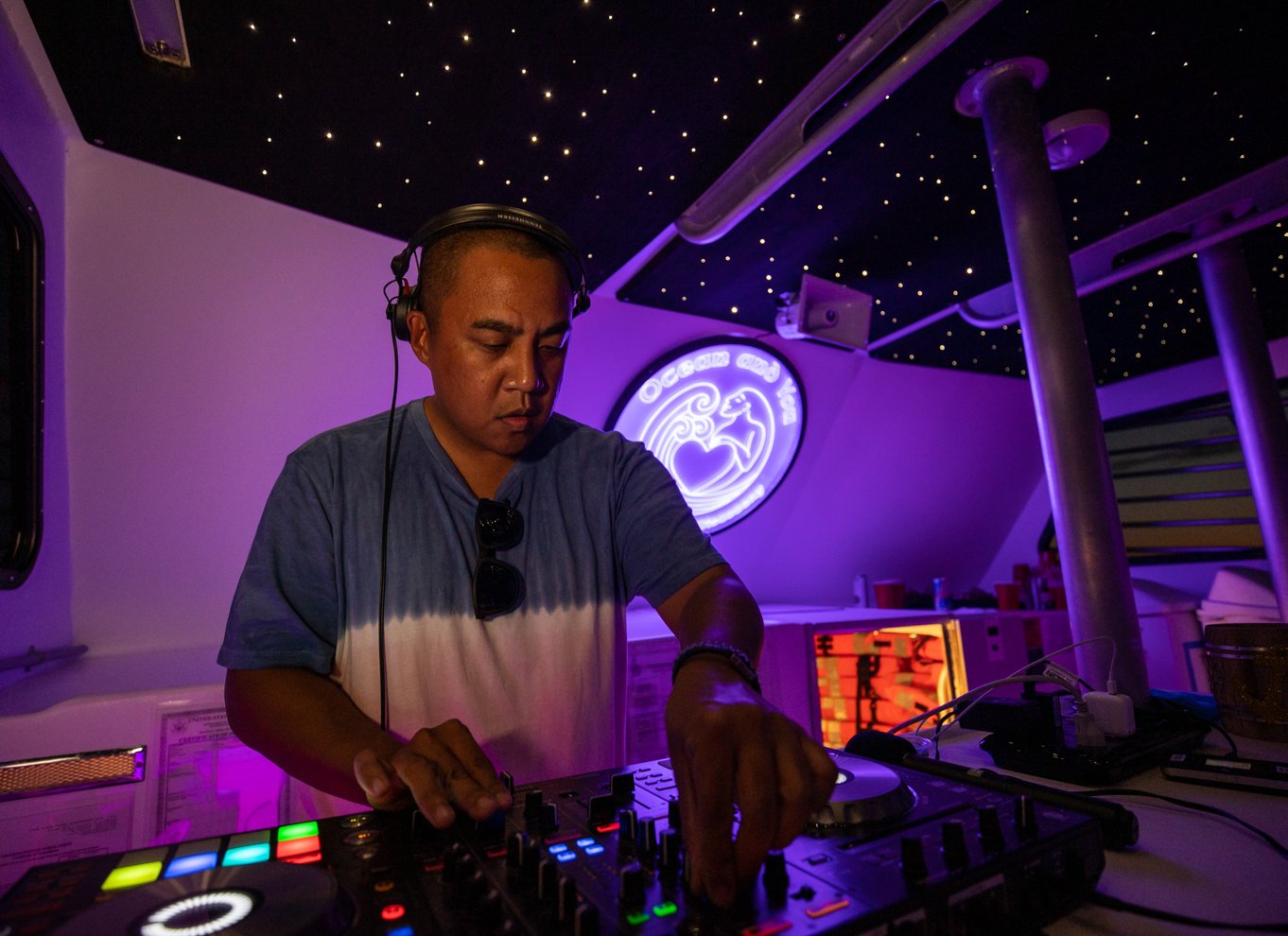 Cuando el sol se oculta en el horizonte, el barco se ilumina en un vibrante tono púrpura con luces centelleantes en lo alto. Un DJ en directo te entretendrá con ritmos contemporáneos a través de los altavoces de sonido envolvente mientras bailas al ritmo del espectáculo de luces a bordo.