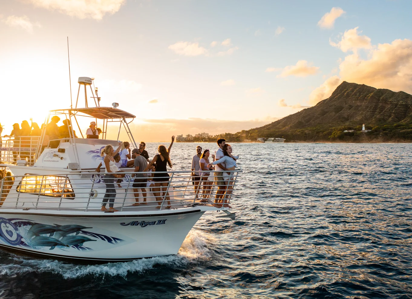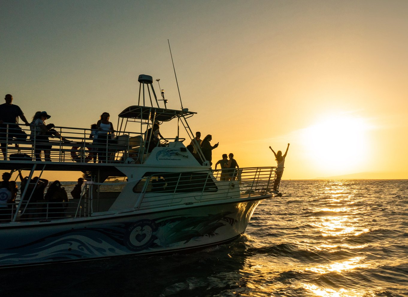 Sube a bordo de un moderno barco en el Puerto de Barcos de Kewalo Basin para iniciar tu viaje hacia la puesta de sol. Tras una sesión informativa sobre seguridad y un brindis en grupo, podrás explorar las dos cubiertas del barco, los asientos envolventes y la proa estilo Titanic. Se pueden comprar bebidas alcohólicas a bordo, y se comprobará el DNI antes de embarcar.