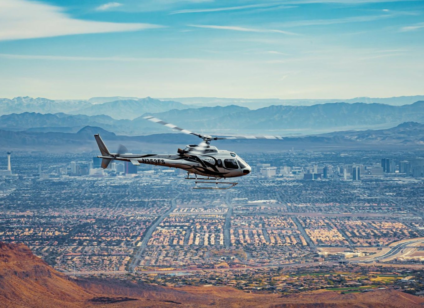 - Siente la emoción de sobrevolar el emblemático horizonte de Las Vegas en helicóptero