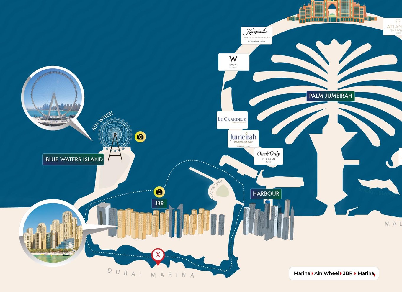- Prenez des photos de lieux d'intérêt emblématiques tels que l'imposante roue Ain et JBR.