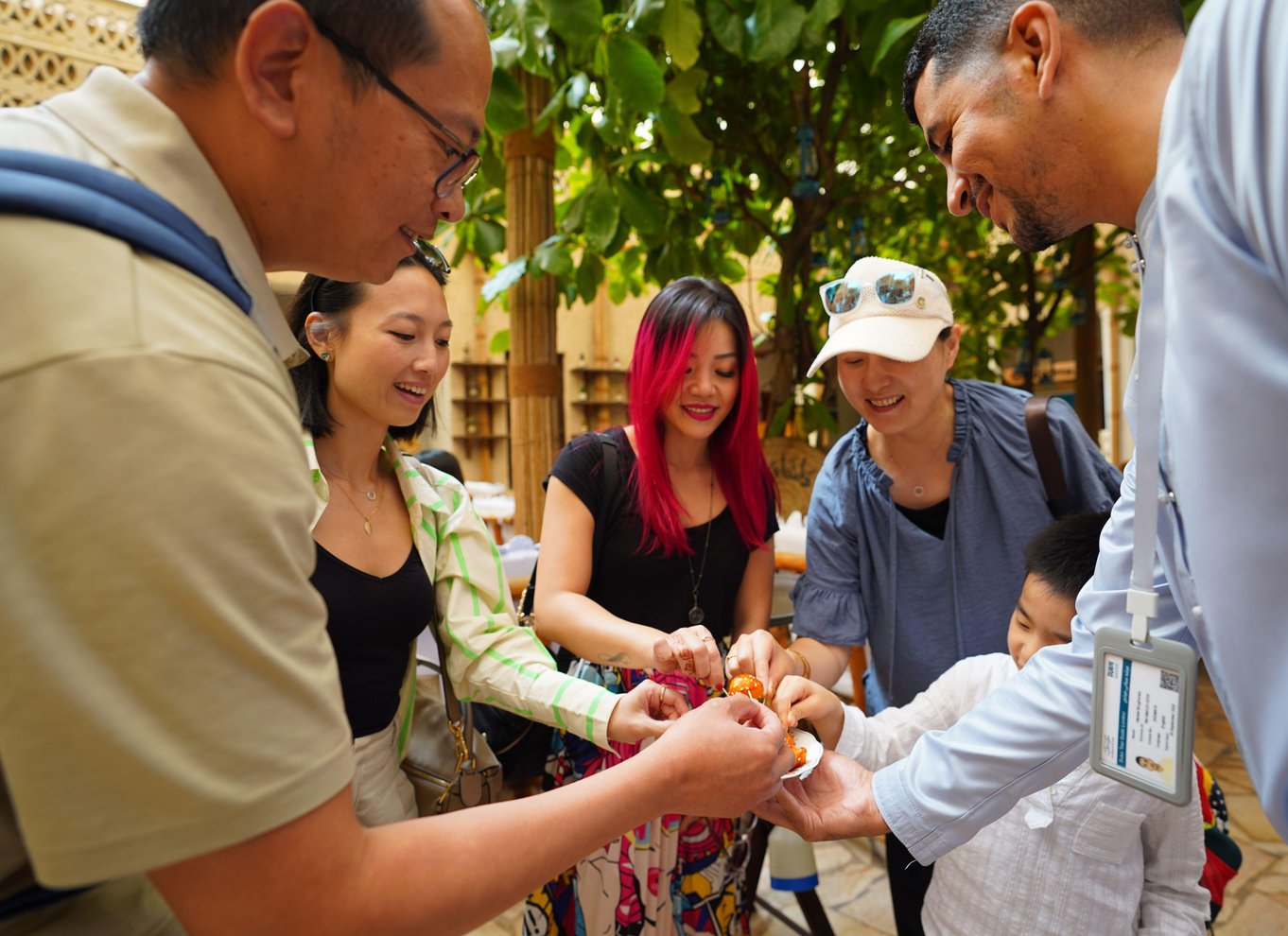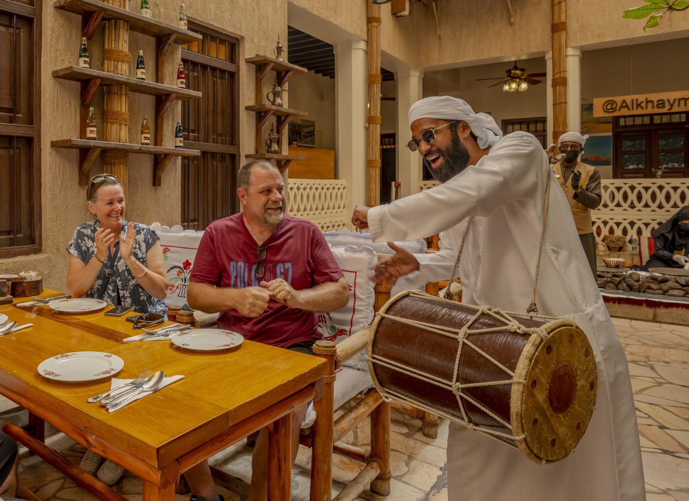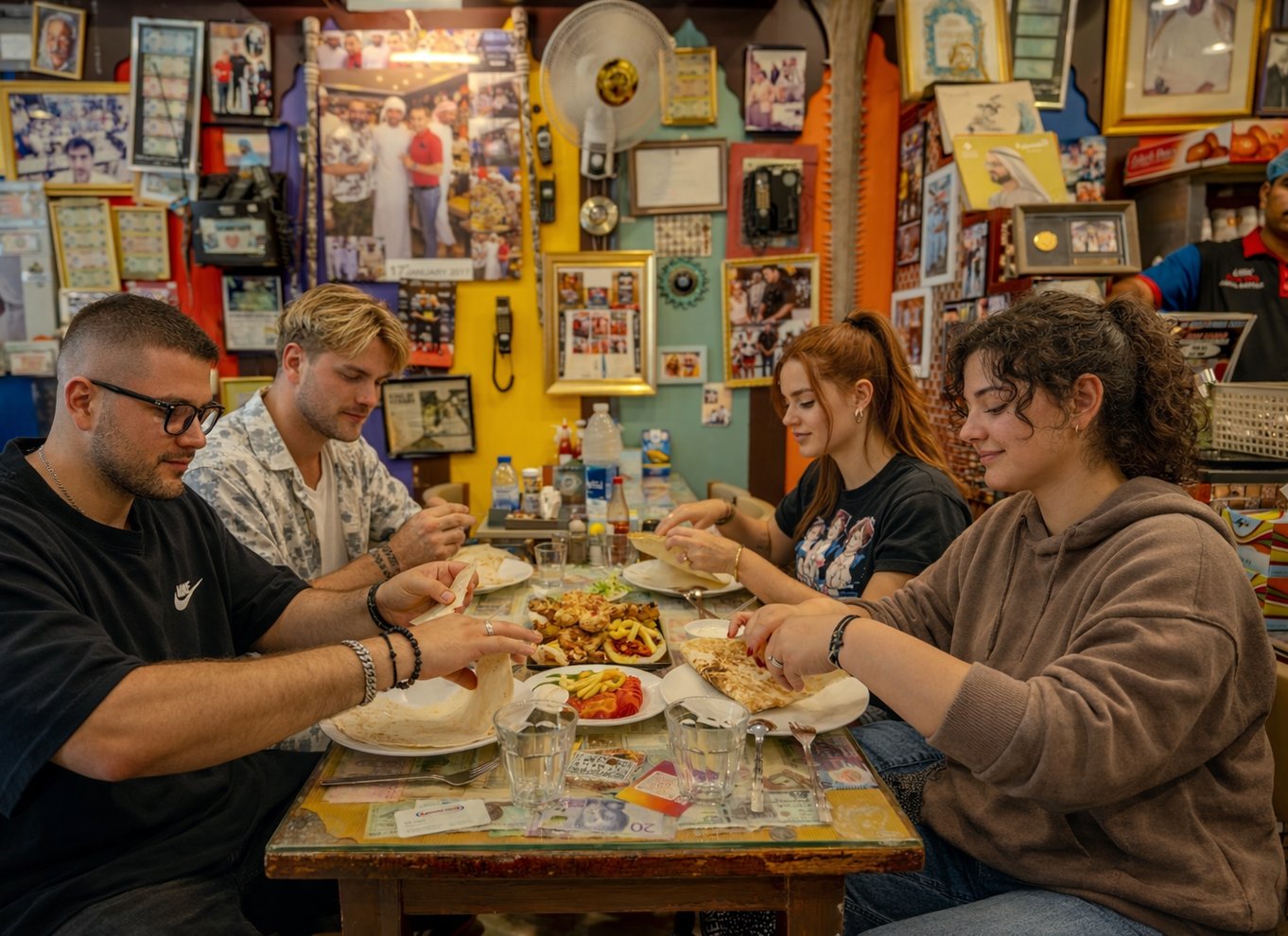 Nous nous dirigerons ensuite vers Kabab Al Ustad, un établissement local réputé pour ses kebabs iraniens alléchants. Vous dégusterez un plateau mixte de viandes grillées accompagné d'une soupe iranienne traditionnelle. Vous plongerez ensuite dans la cuisine émiratie au restaurant Al Khayma Heritage, reconnu par le guide Michelin. Vous dégusterez du majboos d'agneau, des luqaimat (boulettes sucrées) et siroterez un café arabe dans un cadre traditionnel.