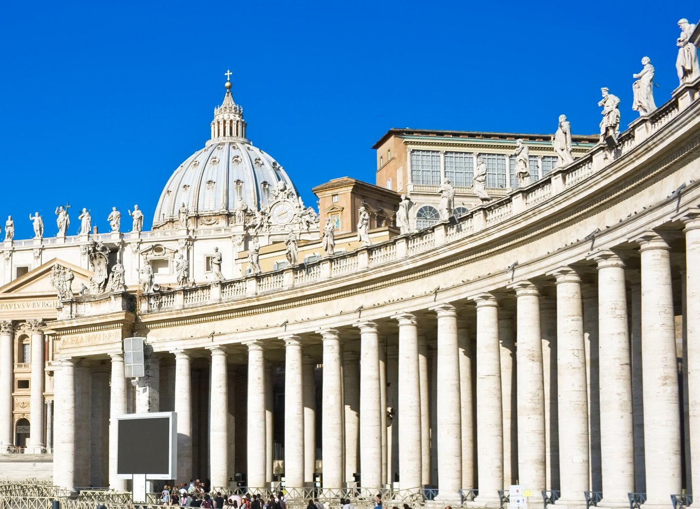 En quittant le musée, suivez votre guide et rejoignez la place Saint-Pierre, dominée par l'imposante coupole de Michel-Ange et entourée de la célèbre double colonnade du Bernin, qui abrite la basilique Saint-Pierre, l'église chrétienne la plus importante du monde.