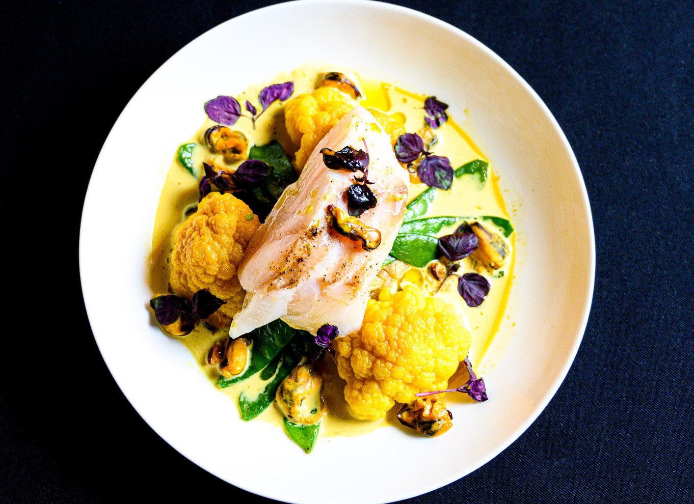 Medaglioni di pesce di scoglio con riso gratinato al sedano e condimento di mirtilli rossi e semi di zucca.